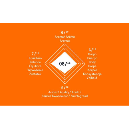 - Profil Sensoriel: Un équilibre parfait entre arôme, corps et acidité. Arôme 6/10, Corps 6/10, Acidité 5/10, Équilibre 7/10, Intensité 8/15.